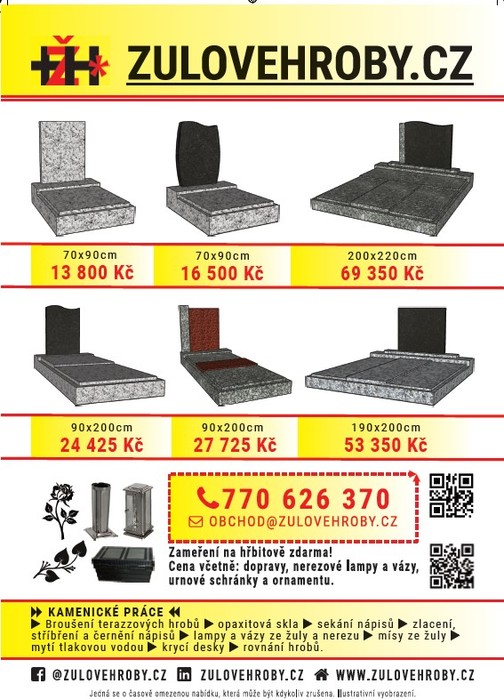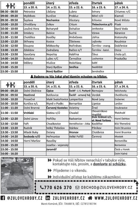 Firma Žulové hroby.cz bude ve čtvrtek 16. a 23. června od 11:00 do 11:20 na našem hřbitově přijímat objednávky k opravám hrobů a poskytovat veškeré kamenické práce.