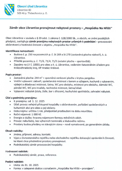 Úvod > Obec > Aktuality > Obec Librantice pronajímá Hospůdku na hřišti
