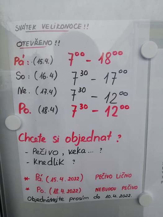 Úvod > Obec > Aktuality > Objednávky a otevírací doba prodejny o Velikonocích