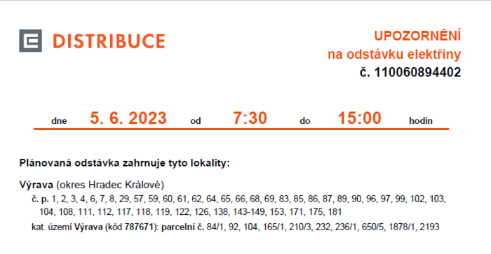 Úvod > Obec > Aktuality > Odstávka ČEZ Distribuce 5.6.2023