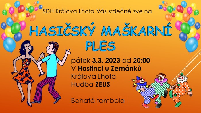 Pozvánka na Hasičský maškarní ples v Králově Lhotě 3.3. od 20 hodin