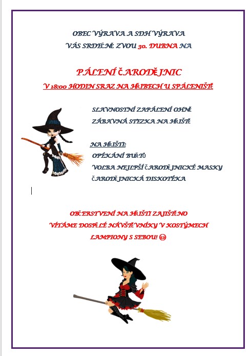 Úvod > Obec > Aktuality > Pozvánka na Pálení čarodějnic 30. dubna od 18 hodin