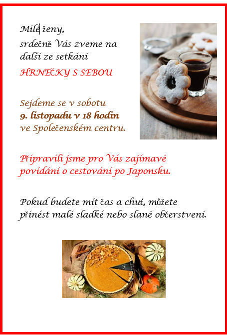 Úvod > Obec > Aktuality > Pozvánka na posezení žen v sobotu 9. listopadu