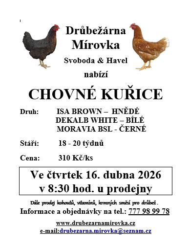 Úvod > Obec > Aktuality > Prodej chovných kuřic 16. dubna v 8:30