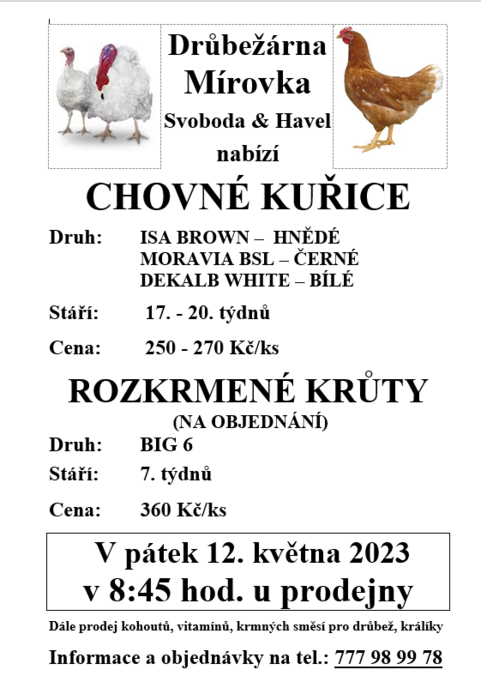 Úvod > Obec > Aktuality > Prodej chovných kuřic a krůt - pátek 12. května v 8:45