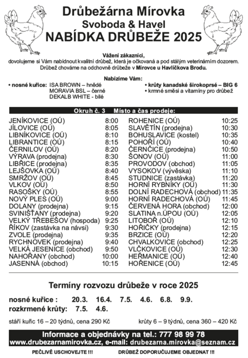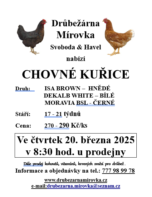 Úvod > Obec > Aktuality > Prodej chovných kuřic - čtvrtek 20.3. v 8:30