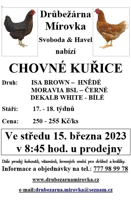 Prodej chovných kuřic Drůbežárna Mírovka - středa 15. března v 8:45