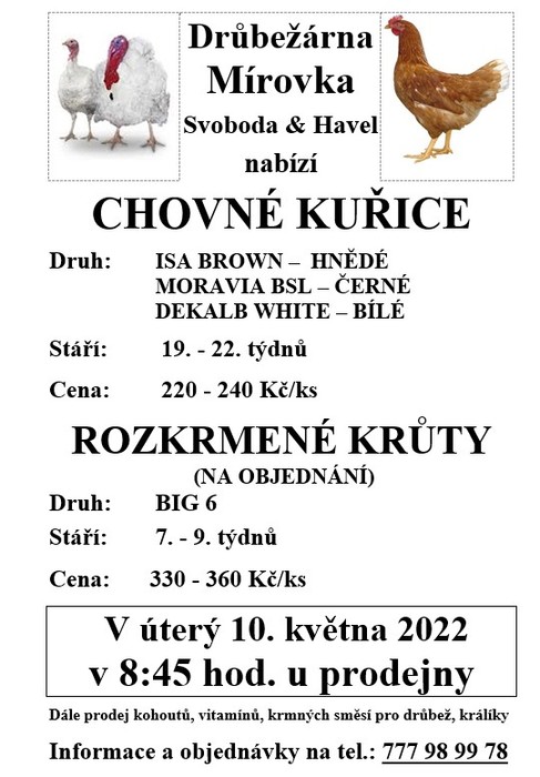 Úvod > Obec > Aktuality > Prodej chovných kuřic Drůbežárna Mírovka - úterý 10. května v 8:45