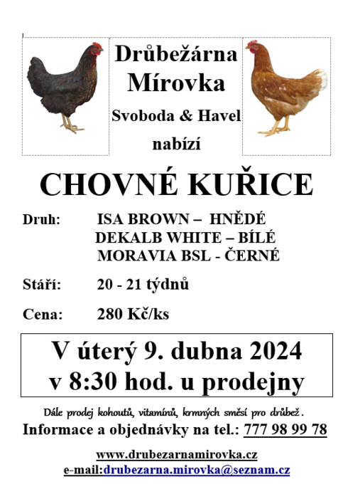 Úvod > Obec > Aktuality > Prodej chovných kuřic Drůbežárna Mírovka - úterý 9. dubna v 8:30