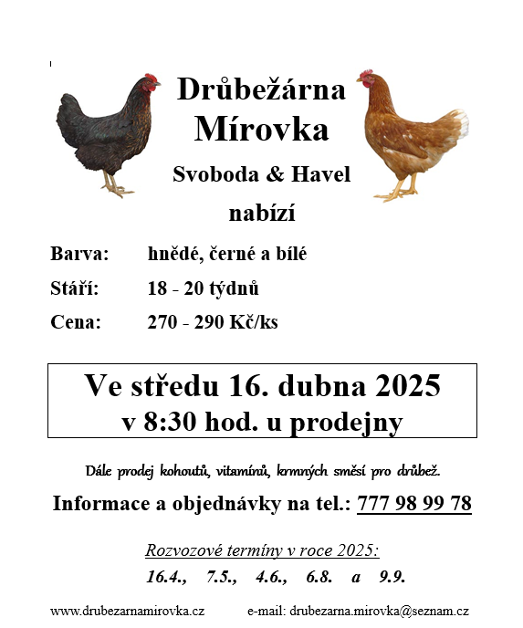 Úvod > Obec > Aktuality > Prodej kuřic - středa 16. dubna v 8:30