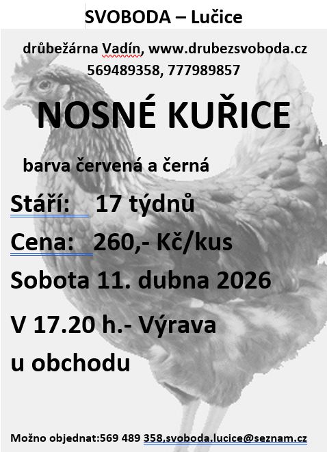 Úvod > Obec > Aktuality > Prodej nosných kuřic 11.4.v 17:20