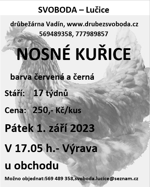 Úvod > Obec > Aktuality > Prodej nosných kuřic - pátek 1. září v 17.05 hodin