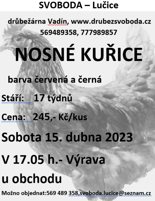 Úvod > Obec > Aktuality > Prodej nosných kuřic - sobota 15. dubna v 17:05