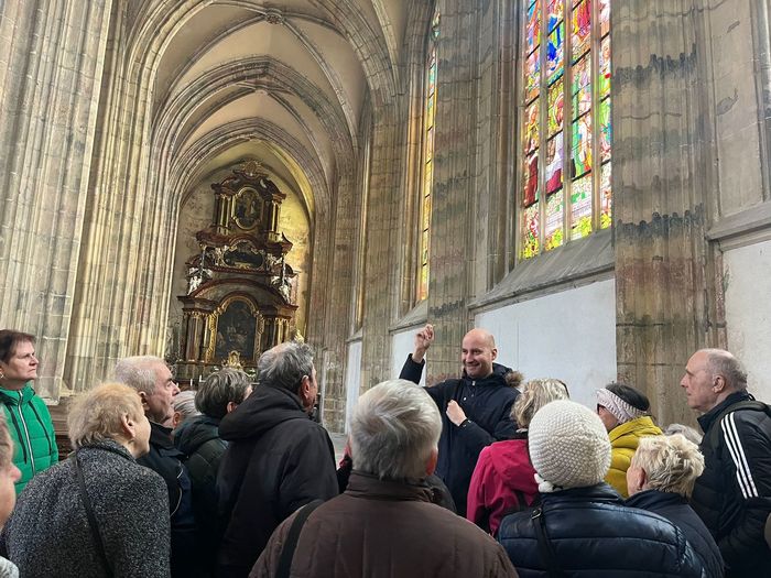 V rámci komunitní práce naše MAS NAD ORLICÍ uspořádala výlet pro seniory do Kutné Hory. Místo bylo vybráno ze získaných dotazníčků od účastníků předešlého výletu, a také při pravidelných setkáních, kde se Kutná Hora zmiňovala velmi často. Vyjíždělo se v časných ranních hodinách. Díky tomu jsme ovšem mohli pozorovat krásný východ slunce, který předesílal nádherný den. O naši bezpečnost a pohodlnou jízdu se postaral náš již spolehlivý dopravce. Jejich krásný a velmi pohodlný autobus si senioři vždy velmi chválí. Dovolím si citovat jednu pasažérku: „Jéé tak krásným autobusem jsem ještě nikdy nejela „. To mě, i pana řidiče velmi potěšilo hned zkraje dne. I přes nečekanou objížďku jsme všichni v pořádku a s dobrou náladou dorazili do Kutné Hory včas. U Chrámu sv. Barbory náš již očekával velmi příjemný průvodce. Pán velmi ohleduplně počkal, než se již hůře pohyblivý účastníci dostaví. Zvolení prohlídky chrámu s průvodcem byla velmi dobrá volba, jelikož jsme se mimo všeobecně známé informace dozvěděli i mnoho jiných zajímavých podrobností. Mohu například vypíchnout, že chrám se až do své podoby stavěl skoro 600 let, dle toho, jak v dobách minulých docházelo stříbro na stavbu chrámu. U této informace se naši senioři velmi pobavili, protože si dali srovnání s dnešními stavbami, a prý to vlastně dnes není zas až tak hrozné ????. Pan průvodce nám také ukazoval rozdíl v pískovci, který byl použit na stavbu. Vyprávění bylo velmi hezké, pan průvodce měl příjemný hlas a bylo znát, že provázení pro něj není jen prací, ale též koníčkem. Po krásné a zajímavé prohlídce ikony Kutné Hory jsme se všichni společně přesunuli na oběd. Velmi nás potěšilo, že ještě pár minut před otevřením restaurace nás vpustili dovnitř, poněvadž se začal zvedat studený vítr. Naši senioři měli zamluvené menu v podobě hovězího vývaru s nudlemi, svíčkové na smetaně, nebo řízek. Všichni si velmi pochvalovali jak ohromné porce, tak chuť. U obědu jsme se rozdělili do dvou skupin. Jedna si mohla dál vychutnávat klid po obědě, dát si kávu, či se projít po okolí. Druhá skupinka zamířila na prohlídku muzea knihtisku. Prohlídkou v muzeu nás provedl sám ředitel muzea. Oceňovali jsme nadšení a lásku s jakou o strojích a práci tisku vyprávěl. Názorně nám ukázal, jak fungovali starší stroje. V jejich muzeu se nachází jeden z posledních funkčních strojů. Naši účastníci byli velmi nadšení, obzvláště pánové. Jejich rozjasněné obličeje pro mě byli velkou odměnou ????. Z muzea si také každý, kdo chtěl odnesl vlastně vyrobenou pohlednici. V odpoledních hodinách jsme se všichni sešli a společně k vyrazili k autobusu. Tempo jsme samozřejmě uzpůsobili pomalejším účastníkům. Pomalejší tempo je pro nás pracovnice, vždy vítanou příležitostí ke komunikaci se seniory. Povídáme si s nimi a jsme pro ně vítanou společností. Vyslechneme, respektujeme jejich názor, přidáme úsměv. Po cestě zpět byla v autobuse velmi veselá nálada. To i díky z jednomu účastníků, který byl hodně veselá kopa. Rozesmával jak řidiče, účastníky, tak i my pořadatelky jsme chvílemi brečeli smíchy. Na zpáteční cestě jsem poděkovala všem účastníkům za důvěru, kterou do nás vložili, řidiči a panu majiteli autobusu za bezpečnou jízdu. Také jsem poprosila a poté rozdala dotazníčky s otázkami, kam by se chtěli podívat příště. A též o pár slov k zpětné vazbě. Zpětná vazba mě i mým kolegyním udělala ohromnou radost. Je krásné číst, že byli spokojeni, že velmi rádi pojedou zas, že nás pochválí za organizaci a ohleduplnost.