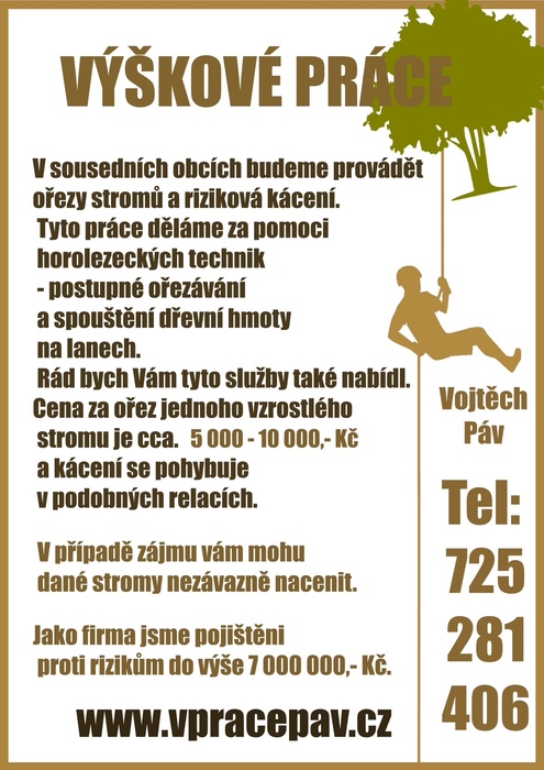 Úvod > Obec > Aktuality > Riziková kácení a ořezy stromů - nabídka výškových prací