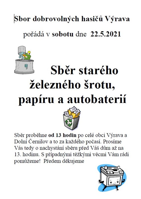 Sbor dobrovolných hasičů Výrava pořádá v sobotu dne 22.5.2021 sběr starého železného šrotu, papíru a autobaterií. Sběr proběhne od 13 hodin po celé obci Výrava a Dolní Černilov a to za každého počasí. Prosíme Vás tedy o nachystání sběru před Váš dům až na 13. hodinu. S případnými těžkými věcmi Vám rádi pomůžeme! Předem děkujeme, SDH Výrava