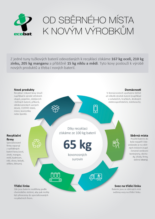 Správným tříděním baterií napomáháme k jejich recyklaci. Čím více vybitých baterií se dostane do recyklačního procesu, tím méně přírodních zdrojů je nutno vytěžit k výrobě nových. Zdraví nebezpečné materiály, které mnohé baterie obsahují, se podaří prostřednictvím recyklace zachytit. Z jedné tuny baterií lze přitom recyklací znovu získat až 167 kg oceli, 210 kg zinku, 205 kg manganu a přibližně 15 kg niklu a mědi. Věděli jste, že zinek z deseti kilogramů baterií poslouží k výrobě mosazi pro jeden saxofon?