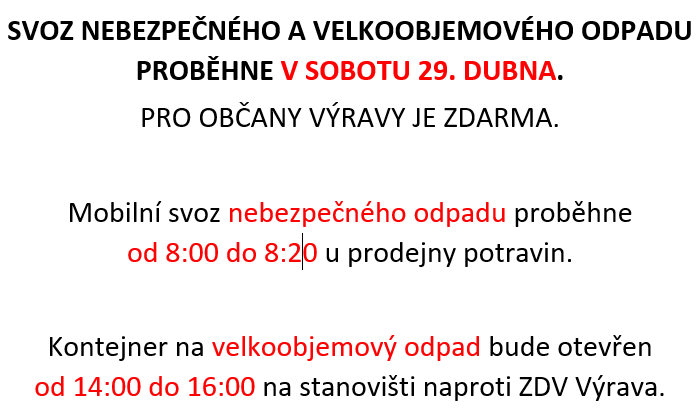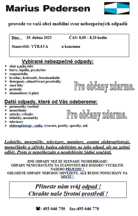 Úvod > Obec > Aktuality > Svoz nebezpečného a velkoobjemového odpadu - 29. dubna 2023