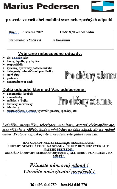 Úvod > Obec > Aktuality > Svoz nebezpečného a velkoobjemového odpadu - 7. května 2022