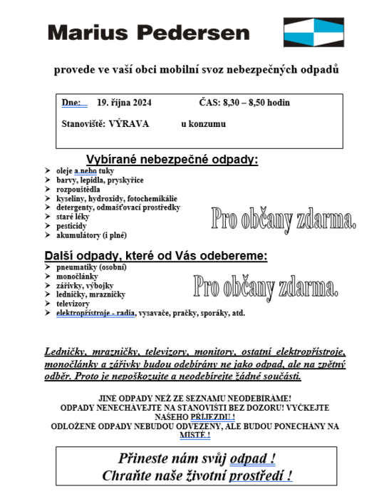 Úvod > Obec > Aktuality > Svoz nebezpečného a velkoobjemového odpadu proběhne v sobotu 19. října