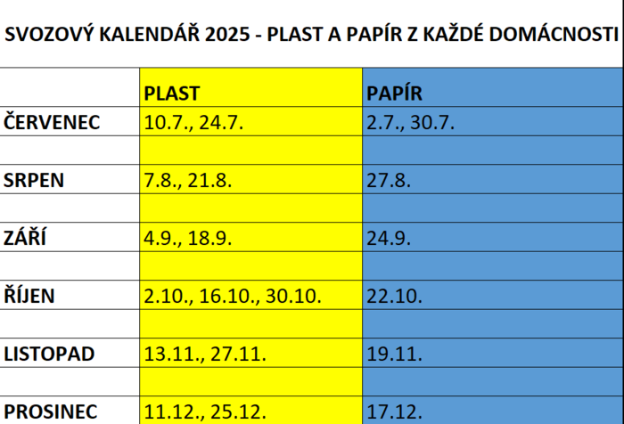 Úvod > Obec > Aktuality > Tabulka s termíny svozu plastu a papíru ve 2. pololetí roku