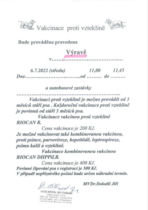 Úvod > Obec > Aktuality > Vakcinace psů proti vzteklině - 6.7. 2022 od 11:00 do 11:45
