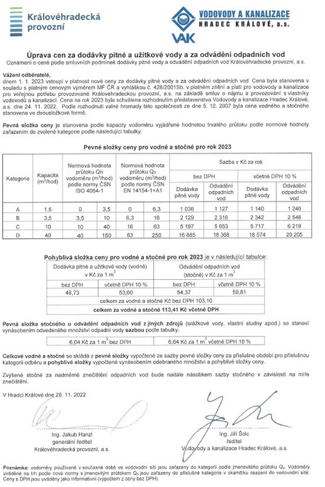 Společnost Vodovody a kanalizace Hradec Králové, a.s. (VAK HK) oznámila svým odběratelům cenu za dodávky pitné a užitkové vody a za odvádění odpadních vod pro rok 2023. Představenstvo společnosti stanovilo cenu pohyblivé složky vodného a stočného od 1. 1. 2023 na 113,41 Kč/m3 včetně 10% sazby DPH.