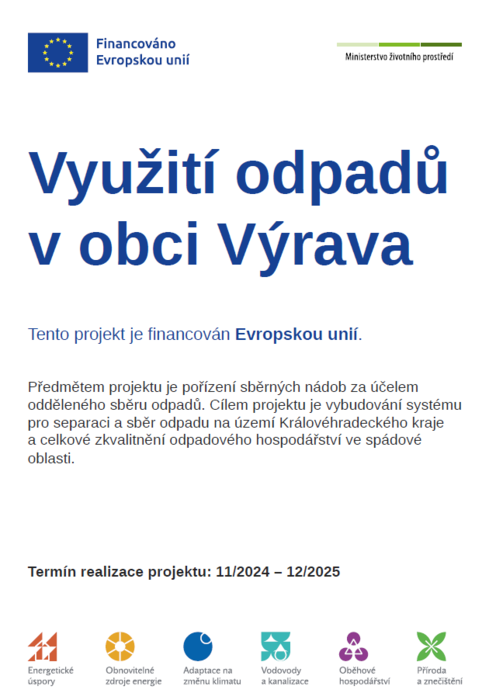 Podpora z Operačního programu Životní prostředí 2021-2027 na realizaci projektu „Využití odpadů v obci Výrava“ z rozpočtu Ministerstva životního prostředí. Jedná se o finanční příspěvek v maximální výši 480 333,70 Kč (70% způsobilých výdajů) na pořízení sběrných nádob do domácností o kapacitě 120 l na separovaný odpad (plast, papír) a na pořízení velkoobjemového kontejneru. Celková výše plnění zakázky je 484 458 Kč bez DPH (586 194,18 Kč včetně DPH), dodavatelem je firma NAODPAD s.r.o. Cílem a přínosem projektu je větší vytříděnost odpadů v obci Výrava.